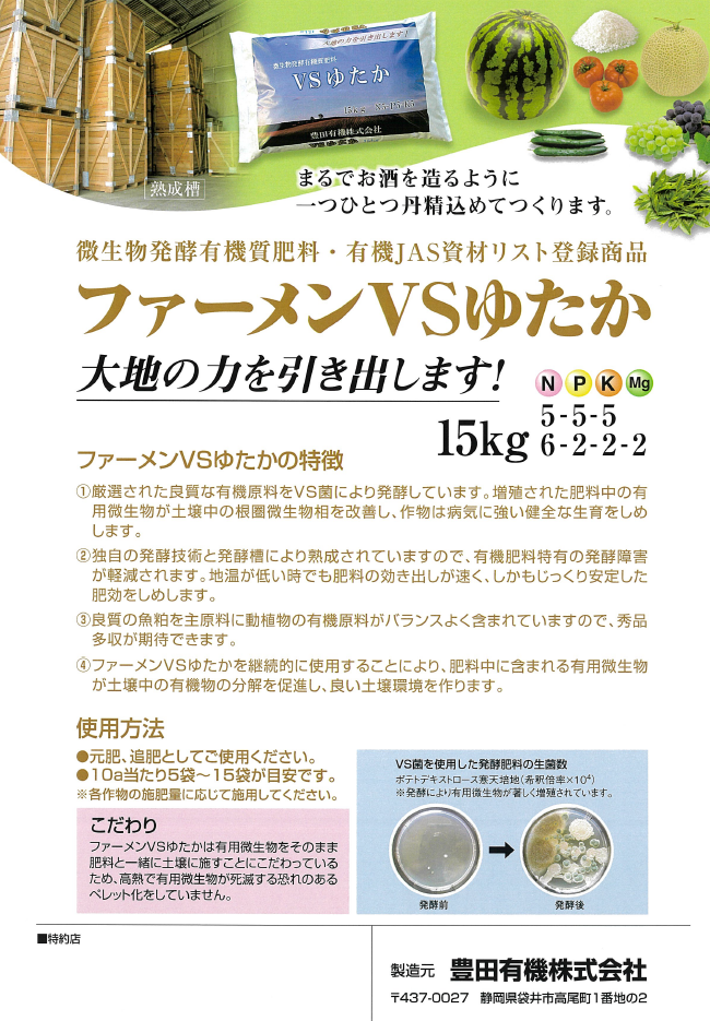 厳選された良質な有機原料をVS菌により発酵しています。増殖された肥料中の有用微生物が土壌中の根圏微生物相を改善し、作物は病気に強い健全な生育を示します。 |